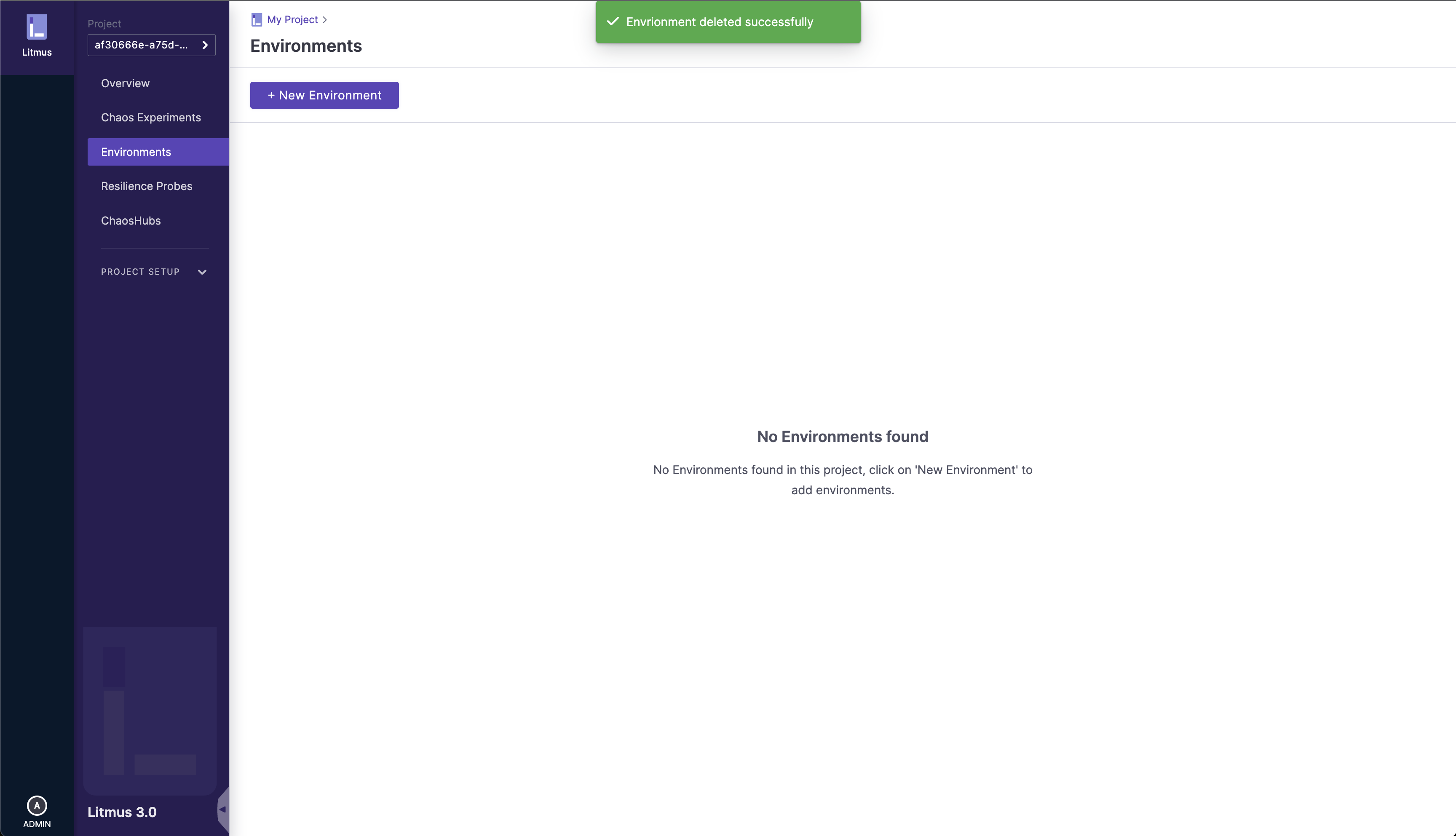 Navigate to the /environments page (Environments sidebar option on the left nav), click on the â‹® icon to open the options menu and select Delete option: